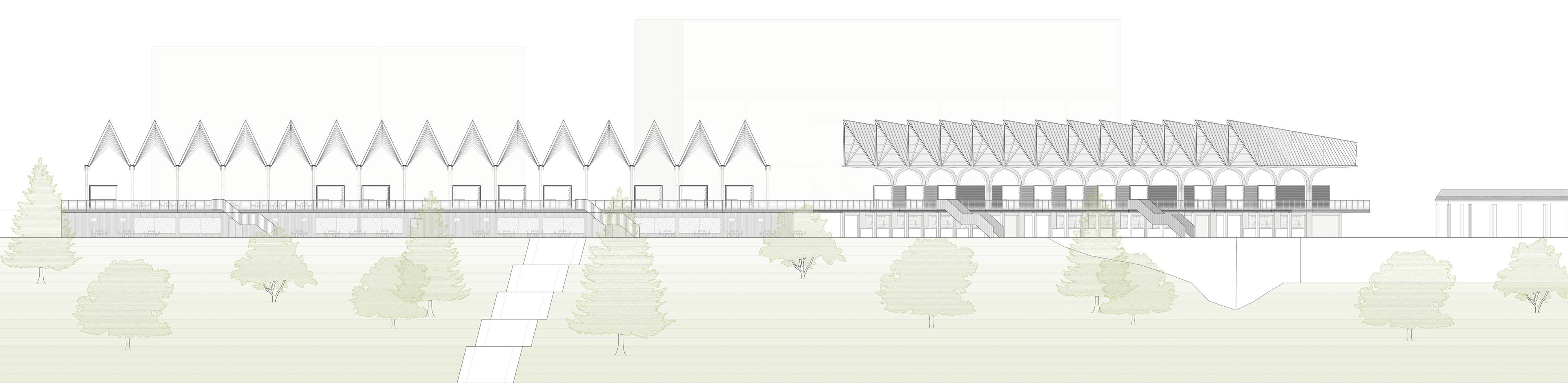 With the aim of reconnecting the green space of the gardens with the rest of the city, the walkway is introduced along the perimeter that forms between the green and paved spaces using an architecture that is permeable to passage and views. This creates a dual purpose for the walkway, on the first floor it serves as a viewing gallery which houses the flower market and on the ground floor it serves as a gateway into the beautiful gardens as well as a hub for the fruit market stalls.